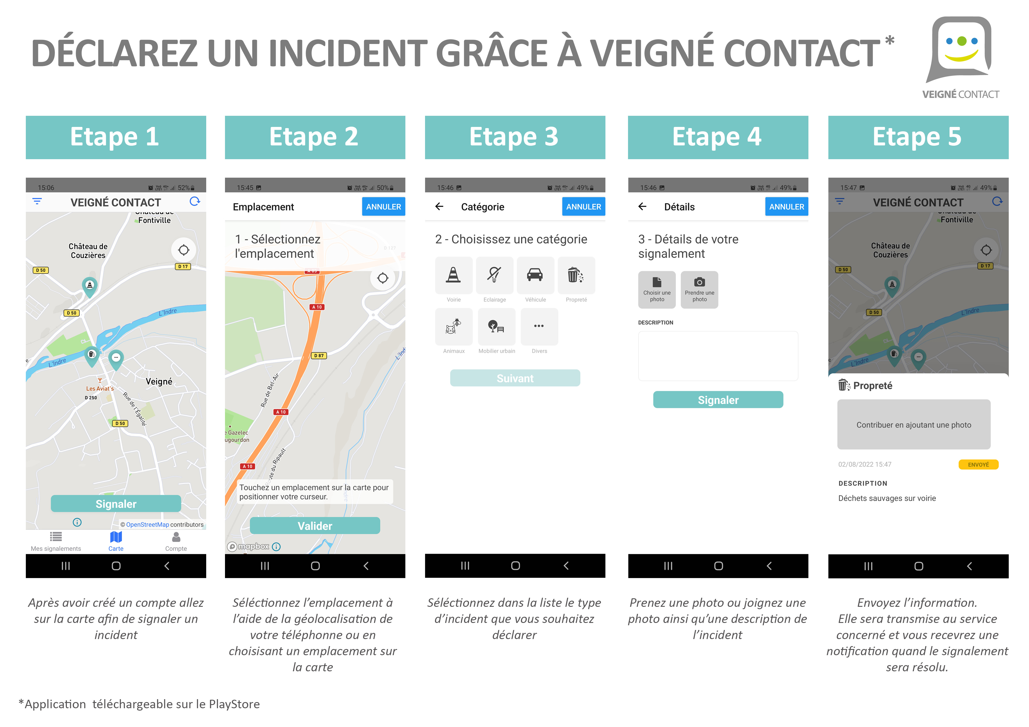 La commune de Veigné vous propose une nouvelle appli : VEIGNE CONTACT, téléchargeable gratuitement sur PlayStore. Ce guichet virtuel vous permettra de signaler les incidents, problèmes que vous rencontrez au quotidien 24h sur 24 depuis votre smartphone Android. Vous pouvez aussi suggérer des améliorations.